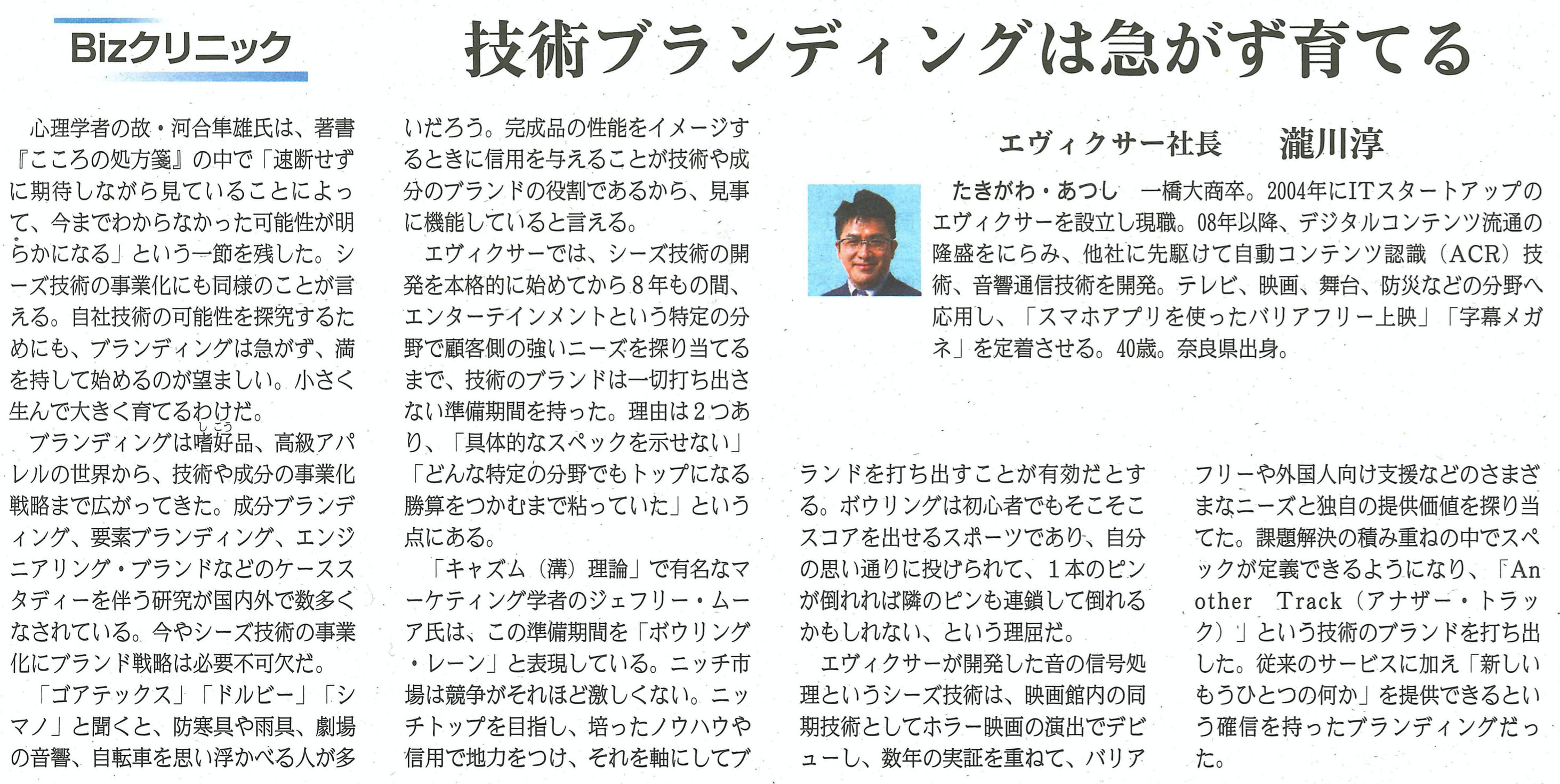 フジサンケイビジネスアイ『【Bizクリニック】技術ブランディングは急がず育てる、エヴィクサー社長、瀧川淳』、→ 紙面はこちら。フジサンケイビジネスアイ『【Bizクリニック】技術ブランディングは急がず育てる、エヴィクサー社長、瀧川淳』、→ 紙面はこちら