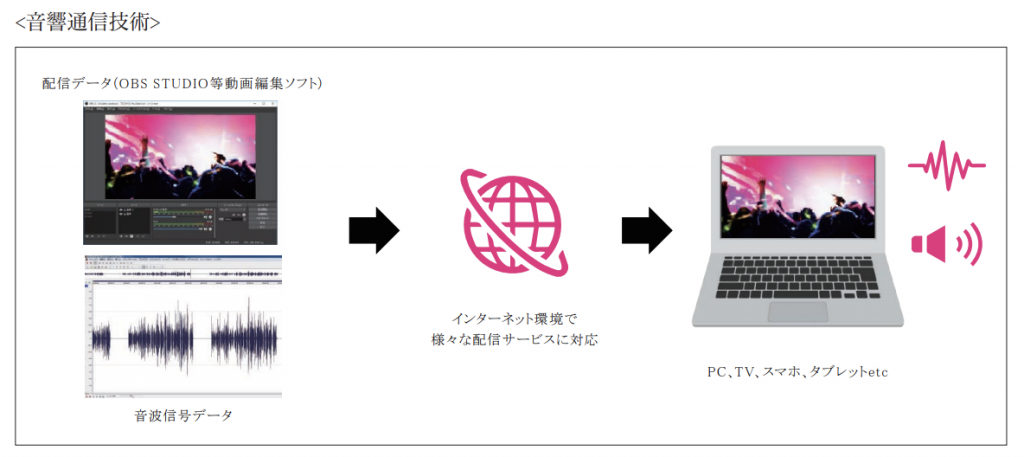 ライブビューイングなど複数の会場で行われる場合でも特別な機材は必要とせず、会場のスピーカーで同期させることができます。実際のコンサートとライブ配信が同時に行われた場合も場所を選ばず、気軽にコンサート会場と同じ一体感を楽しむことができます。また、「音」に関わるものであれば演出を同期させることができるため、ライブ会場、オンライン配信、パッケージ作品だけでなく、テレビやラジオからの音声でも視聴空間を演出することができます。