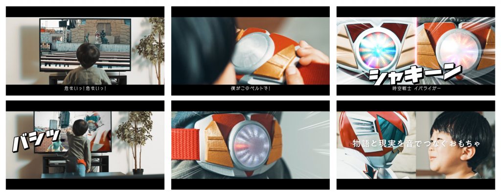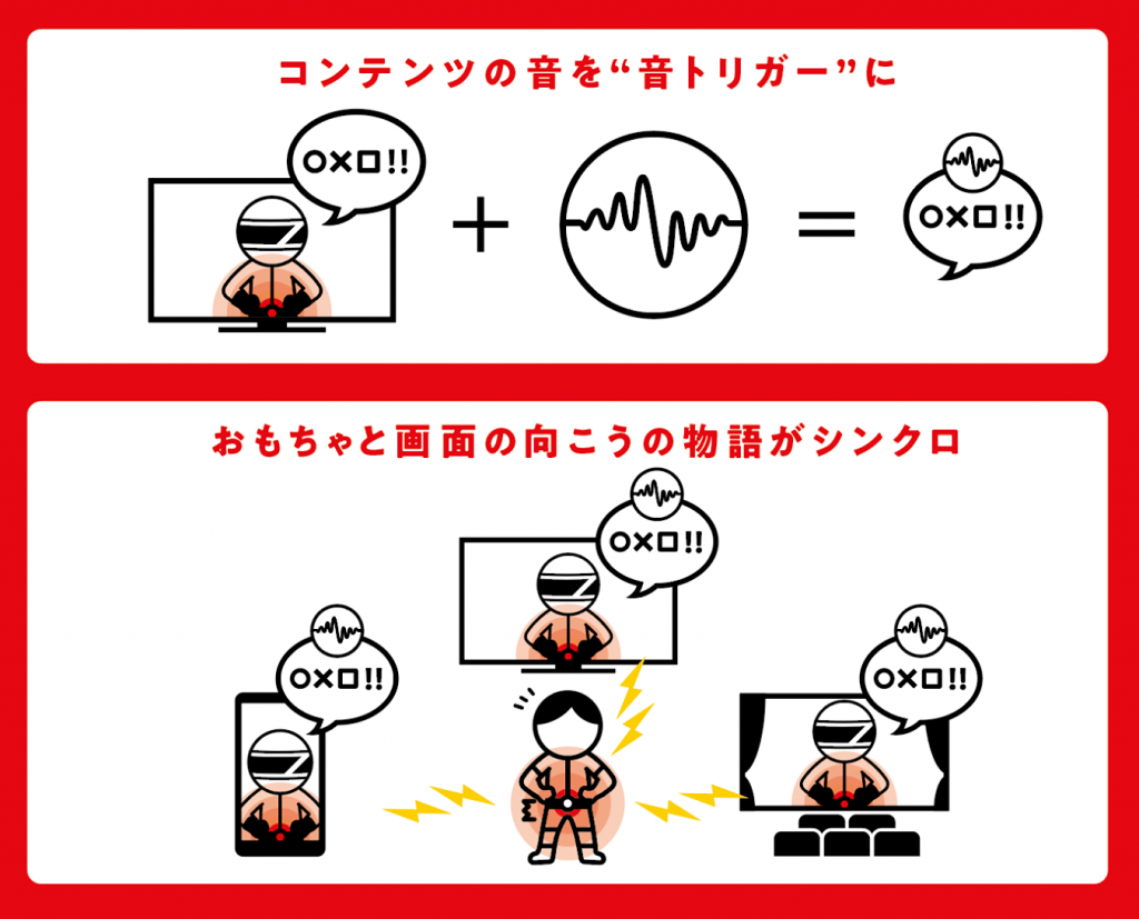 「CONTENTS SYNC TOY」は、視るだけだった映像コンテンツを参加できる空間コンテンツへと拡張するおもちゃのシステムです。効果音や台詞などコンテンツ内の任意の音をトリガー化し、光や振動で連動。画面の向こうで描かれるストーリーに、おもちゃを通して参加しているような体験を楽しむことができます。ネットワーク接続やペアリングといった通信を挟むことなく音で直接連動するため、あらゆるメディアで流れるコンテンツと自動でシンクロすることができます。エヴィクサーの音響通信技術Another Track(R)を用いて、HYTEKのメンバーも含め構成されるプロジェクトチームが企画・プロデュース・デザインをいたしました。
