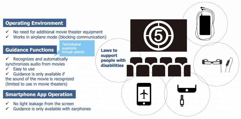 Accessibility is a common issue in the world: movie theaters in the U.S. and elsewhere are trying to offer accessibility by overhauling their projection systems. Due to the Covid-19 pandemic, however, many of them are hesitating to renew their systems due to the severe business situation, while movie producers are reluctant to edit movies to provide accessibility. This situation is a tailwind for Evixar’s “HELLO! MOVIE” system as it does not require significant investment in facilities or editing of the movie itself.