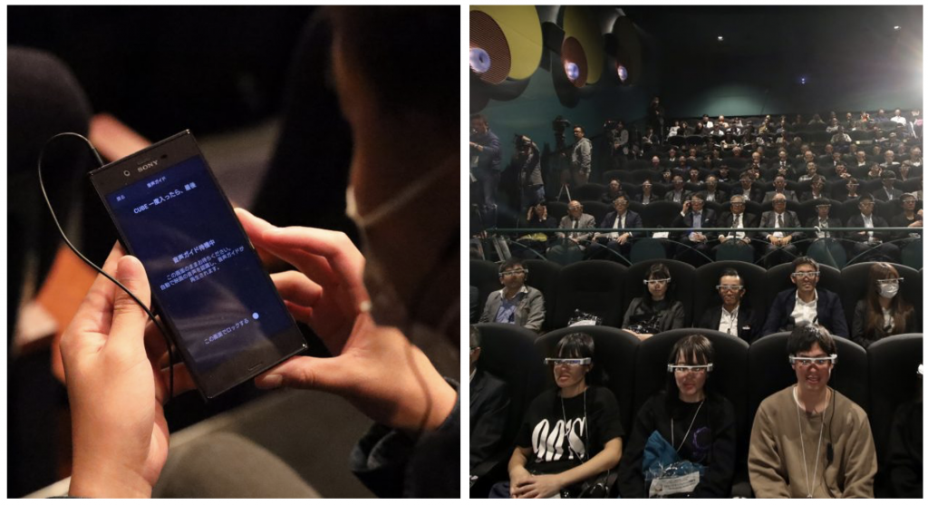日本の映画館では、スマートフォンやスマートグラスで映画の字幕と音声ガイドを楽しむ無料アプリ「HELLO! MOVIE(ハロームービー)」や、映画館が貸し出す「字幕メガネ」によってバリアフリー上映を実現しています。