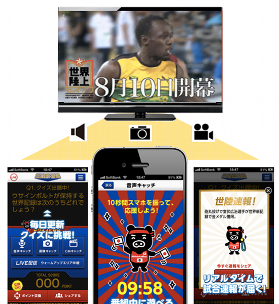2013年8月10日から9日間にわたって、TBS系列で独占生中継される「世界陸上モスクワ 2013」を 視聴しながら、放送時の音声、ロゴイメージ、テレビコマーシャルの映像を認識することをきっかけとして、データ放送との連携や、ポイントが加算されたり、クイズに参加することができるようになるスマートフォン向けアプリです。