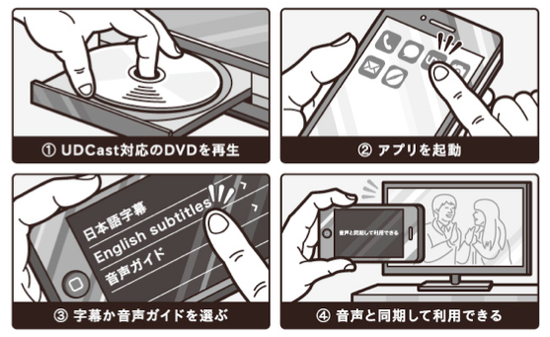 UDCastはNPO法人メディア・アクセス・サポートセンター(MASC)が開発したスマートフォンアプリで、今回の取り組みでは、DVD本編の音声に、音声電子透かし(ACR技術)を使って、タイム情報を埋め込み、UDCastで同期させてバリアフリー字幕や多言語字幕、及び視覚障害者向け副音声等をスマートフォンやメガネ型端末(ウェアラブルデバイス)に送出する仕組みを実現し、普及が進むスマートフォンとアプリをユーザーインターフェースとして活用することで、より多くの方が手軽に情報保障を受けることができる画期的な技術を使った全く新しいDVDとなっております。