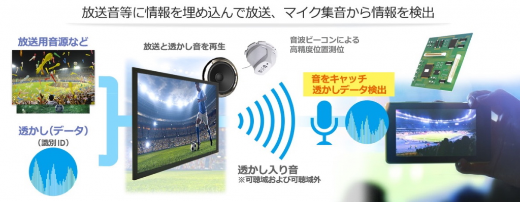 実証実験では、スマートフォンやスマートデバイスなどのモバイル端末に事前に応援アプリをインストールし、場内に設置されたスピーカーやビーコン等から送出される音をモバイル端末のマイクが受信することで、平常時は競技の応援や場内ガイドに、災害発生などの非常時は多言語による避難経路等の情報を表示するなど、災害対応情報の提供を行う中で、武蔵野の森総合スポーツプラザ/味の素スタジアム(東京スタジアム運営)の非常用放送設備で全館をカバーする音響通信Another Trackの機能提供を実現(10kHz以下の可聴透かしによる)いたしました。